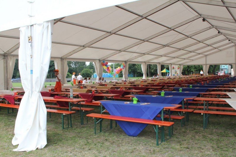 Mieliśmy przyjemność współtworzyć niepowtarzalną atmosferę rodzinnych spotkań. Organizator chciał aby nie zabrakło atrakcji dla żadnej grupy wiekowej. Dlatego zaopatrzyliśmy inwestora w hale namiotową i ławostoły a boki namiotu rozsunęliśmy tak aby było przewiewnie. Nie mogło zabraknąć zabaw dla najmłodszych dlatego pojawiły się dmuchańce i balony.
