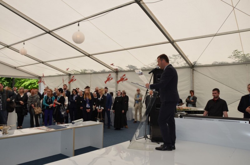 2 czerwca 2015 roku odbyło się wmurowanie kamienia węgielnego pod budowę inwestycji w Gdańsku. Sam event miał uroczysty charakter o czym świadczy jakość wykonania i dbałość o szczegóły - wykonaliśmy zabudowę sceniczną obłożoną białą płytą hips. Na scenie, za mówcą mogą zobaczyć Państwo ekran LED zamontowany na ściance z czarnej płyty hips. Drewnianą podłogę pokrywa niebieska wykładzina. Jako że był to plac budowy, do samej hali namiotowej biegnie ułożony przez nas chodniki, również obity niebieską wykładziną. Całość prezentowała się bardzo estetycznie.